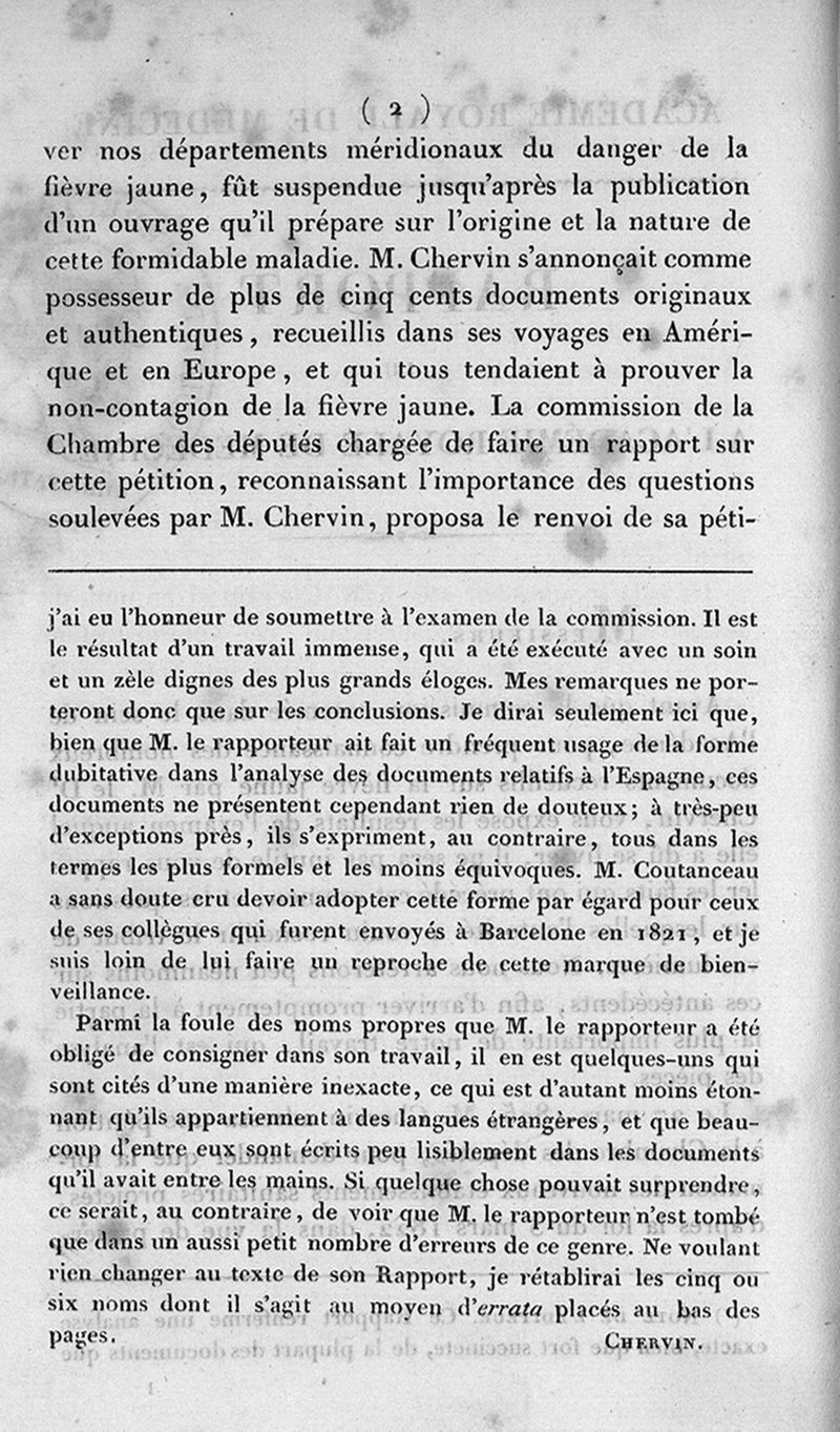 Rapport lu a l'Académie royale de médecine, dans les séances des 15 mai et 19 juin 1827 : au nom de la commission chargée d'examiner les documents de M. Chervin concernant la fièvre jaune