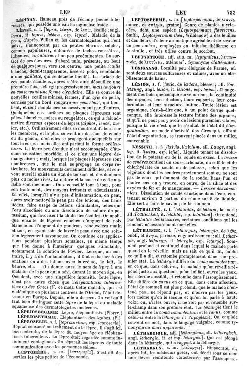 Dictionnaire de médecine, de chirurgie, de pharmacie, des sciences accessoires et de l'art vétérinaire de P.-H. Nysten, 10e édition, entièrement refondue par É. Littré,... Ch. Robin,... Ouvrage augmenté de la Synonymie latine, grecque, allemande, anglaise, italienne et espagnole et suivi d'un glossaire de ces diverses langues