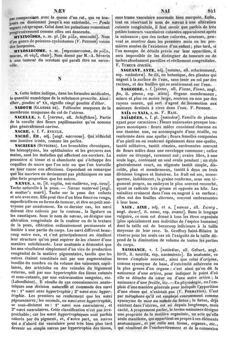 Dictionnaire de médecine, de chirurgie, de pharmacie, des sciences accessoires et de l'art vétérinaire de P.-H. Nysten, 10e édition, entièrement refondue par É. Littré,... Ch. Robin,... Ouvrage augmenté de la Synonymie latine, grecque, allemande, anglaise, italienne et espagnole et suivi d'un glossaire de ces diverses langues