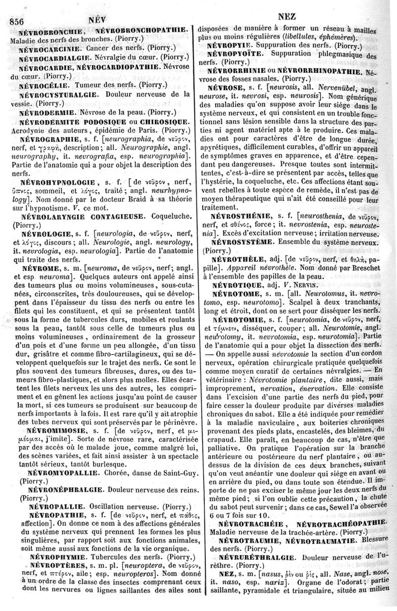 Dictionnaire de médecine, de chirurgie, de pharmacie, des sciences accessoires et de l'art vétérinaire de P.-H. Nysten, 10e édition, entièrement refondue par É. Littré,... Ch. Robin,... Ouvrage augmenté de la Synonymie latine, grecque, allemande, anglaise, italienne et espagnole et suivi d'un glossaire de ces diverses langues