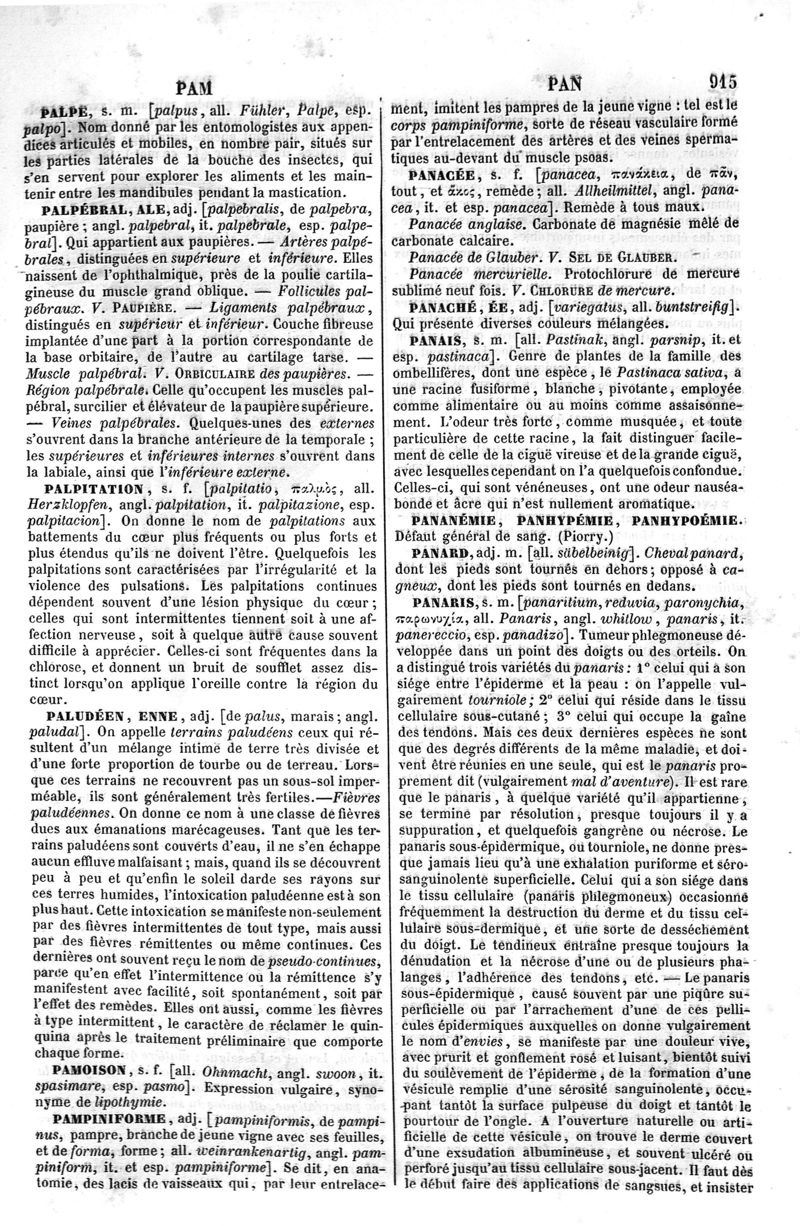 Dictionnaire de médecine, de chirurgie, de pharmacie, des sciences accessoires et de l'art vétérinaire de P.-H. Nysten, 10e édition, entièrement refondue par É. Littré,... Ch. Robin,... Ouvrage augmenté de la Synonymie latine, grecque, allemande, anglaise, italienne et espagnole et suivi d'un glossaire de ces diverses langues