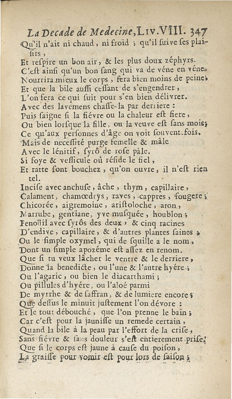Francisci Porti,... Medica decas... La Décade de médecine, ou le Médecin des riches et des pauvres, expliquant les signes, les causes et les remèdes des maladies, composé en vers latins par François Du Port, nouvellement mis en vers françois par M. Du Four