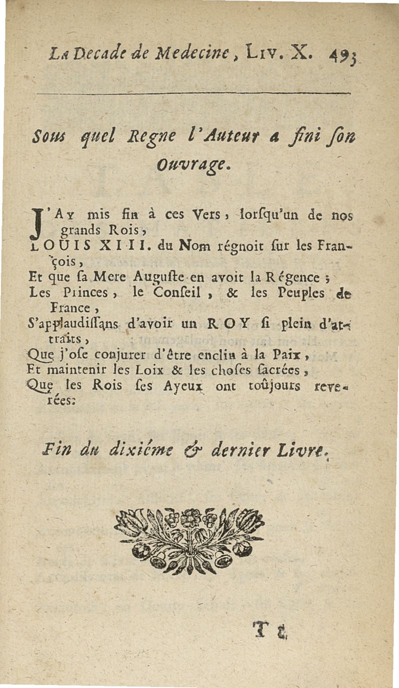 Francisci Porti,... Medica decas... La Décade de médecine, ou le Médecin des riches et des pauvres, expliquant les signes, les causes et les remèdes des maladies, composé en vers latins par François Du Port, nouvellement mis en vers françois par M. Du Four