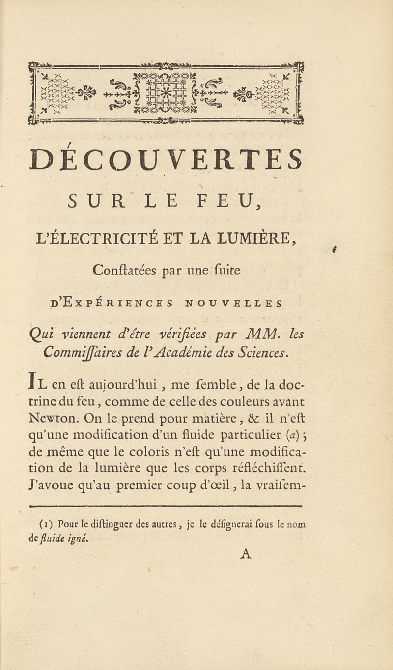Découvertes de M. Marat, docteur en médecine & médecin des gardes du corps de monseigneur le comte d'Artois sur le feu, l'électricité et la lumière, constatées par une suite d'expériences nouvelles qui viennent d'être vérifiées par MM. les commissaires de l'Académie des sciences