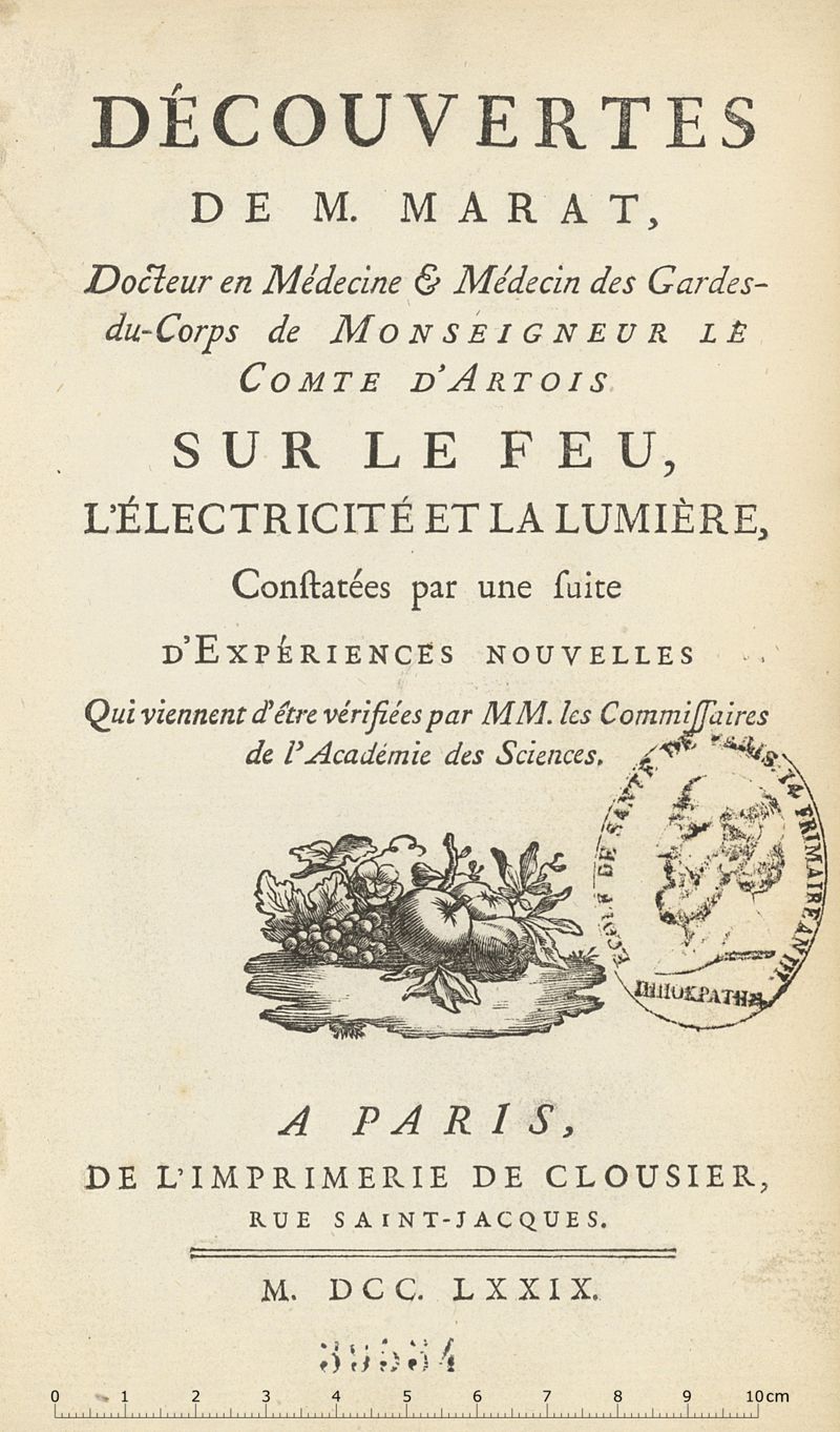 Découvertes de M. Marat, docteur en médecine & médecin des gardes du corps de monseigneur le comte d'Artois sur le feu, l'électricité et la lumière, constatées par une suite d'expériences nouvelles qui viennent d'être vérifiées par MM. les commissaires de l'Académie des sciences