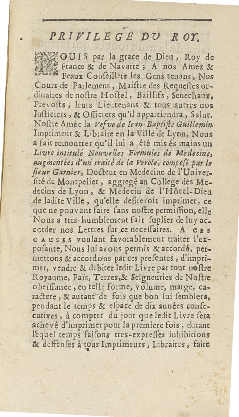 Nouvelles formules de medecine latines et francoises, pour le Grand-Hôtel-Dieu de Lyon utiles aux autres hôpitaux, tant des villes que des armées, & aux jeunes medecins, chirurgiens & apothicaires composées...augmentées d'un traité de la verole ; seconde edition