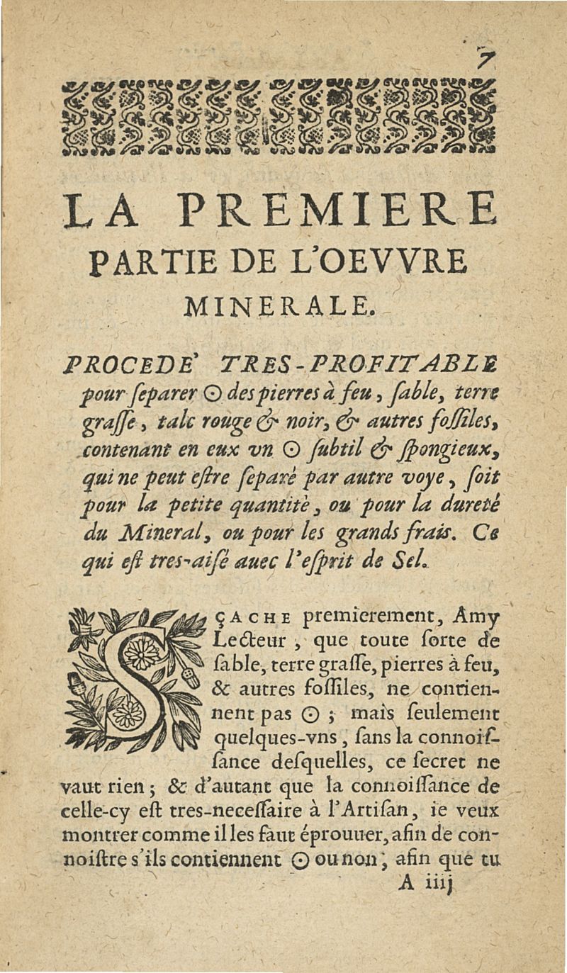 L'oeuvre minerale ou est enseignée la séparation de l'or des pierres à feu, sable, argile, & autres fossiles...mise en françois par le sieur Du Teil