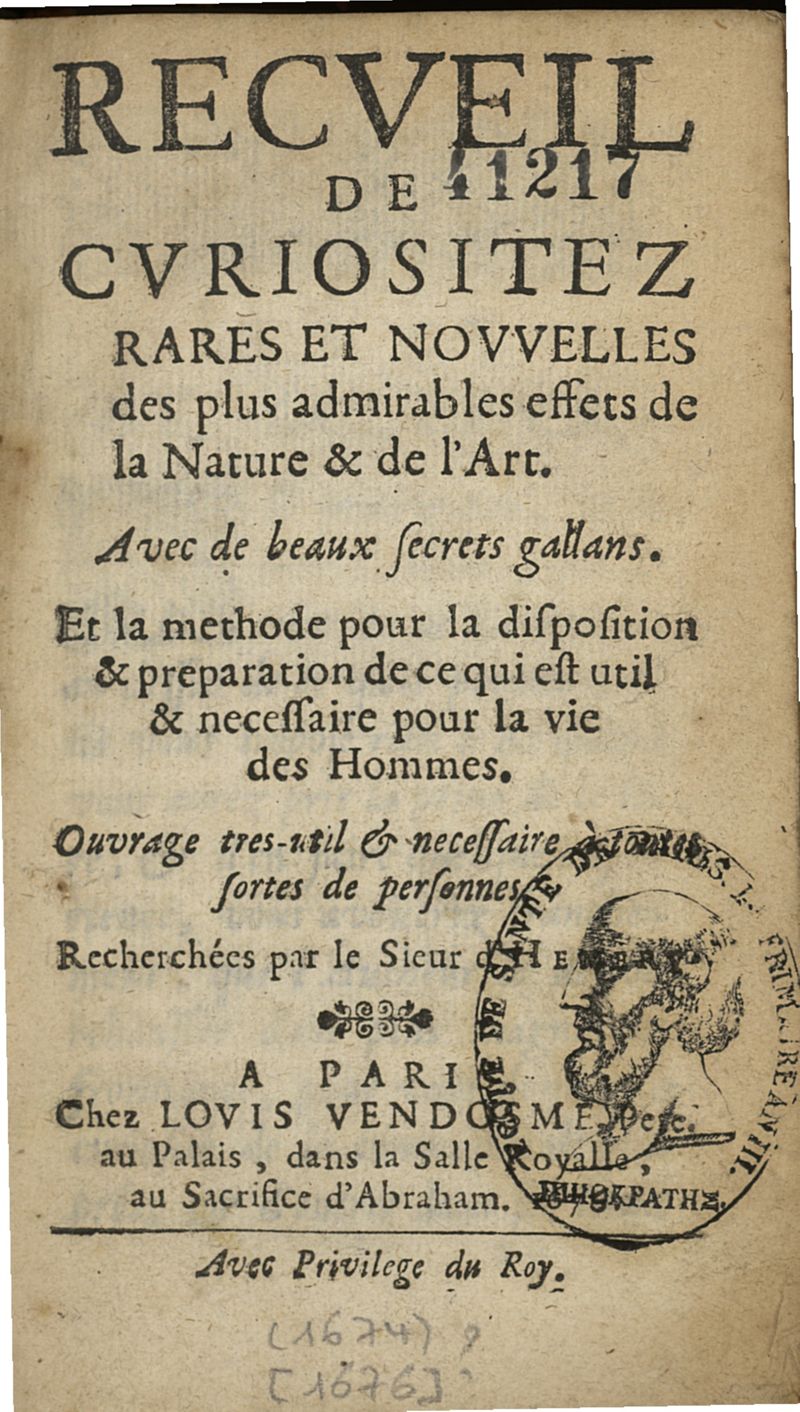 Recueil de curiositez rares et nouvelles des plus admirables effets de la nature et de l'art avec de beaux secrets gallans, et la méthode pour la disposition et préparation de ce qui est util et nécessaire pour la vie des hommes... recherchées par le sieur d'Hémery