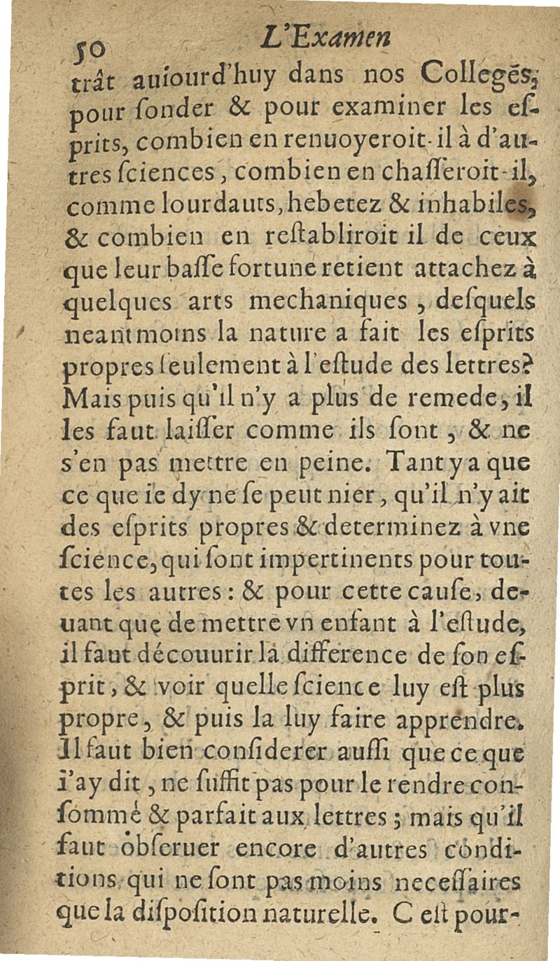 L'examen des esprits pour les sciences où se monstrent les différences d'Esprits...augmenté de la derniere impression d'Espagne