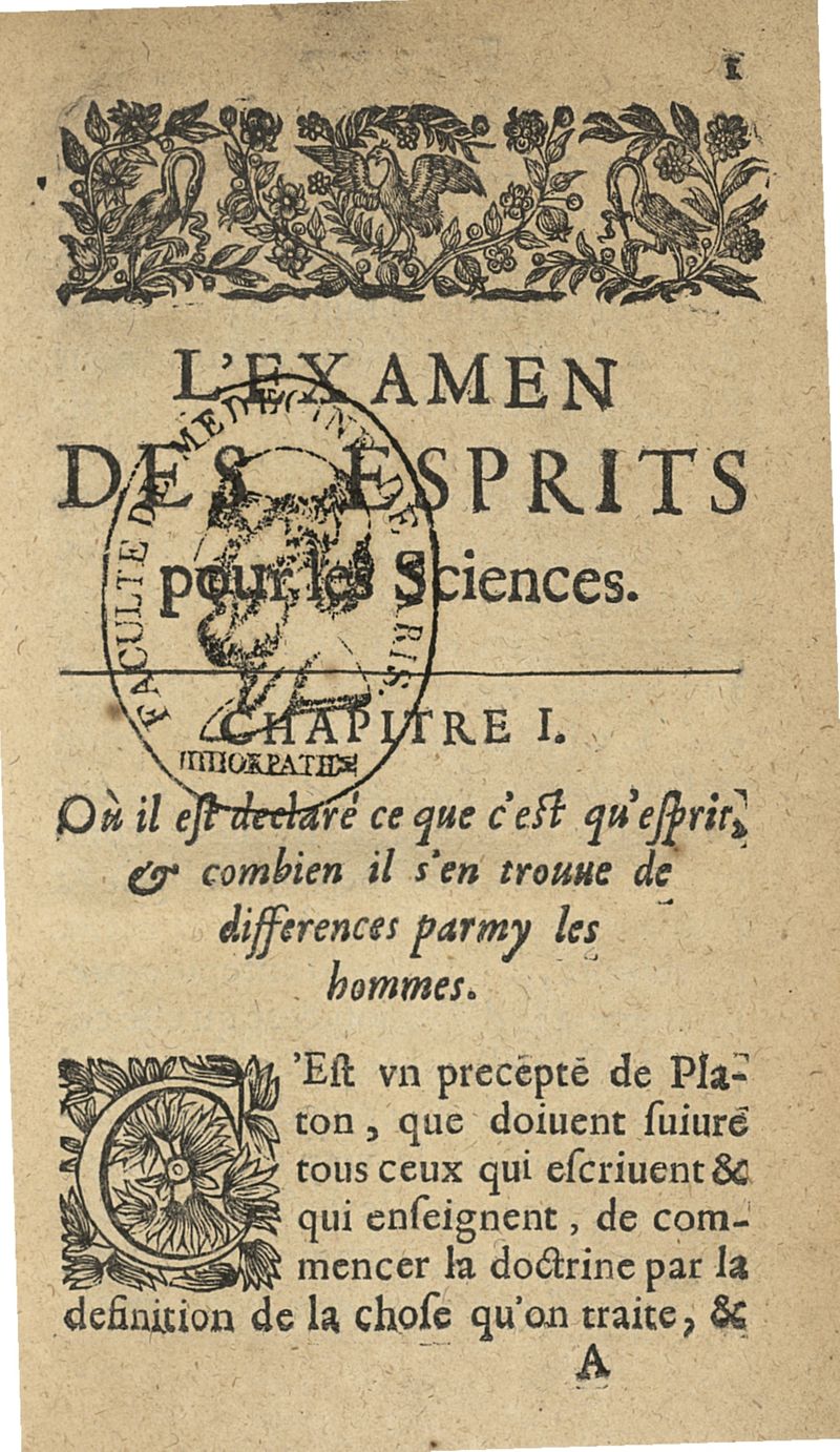 L'examen des esprits pour les sciences où se monstrent les différences d'Esprits...augmenté de la derniere impression d'Espagne