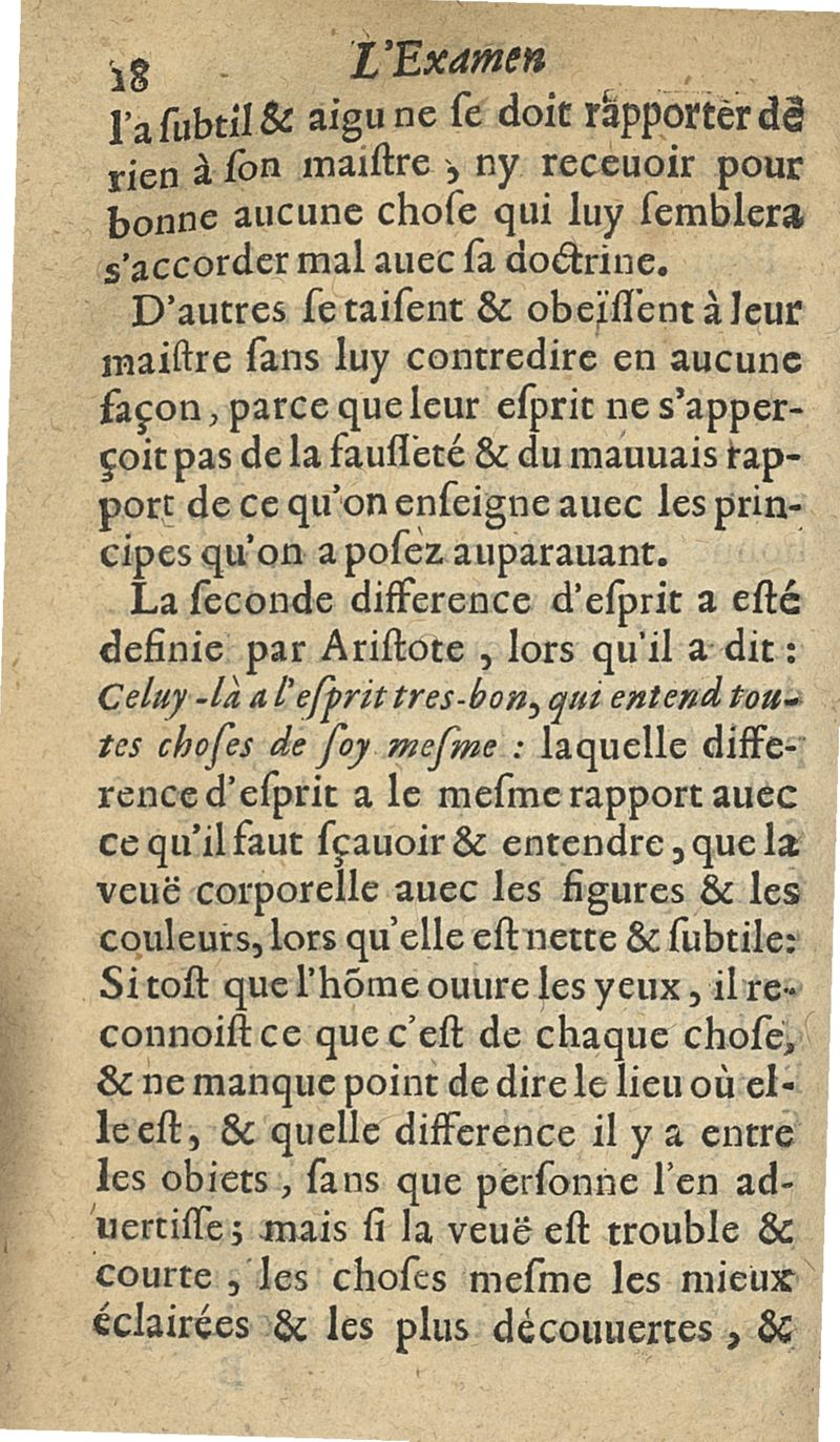 L'examen des esprits pour les sciences où se monstrent les différences d'Esprits...augmenté de la derniere impression d'Espagne