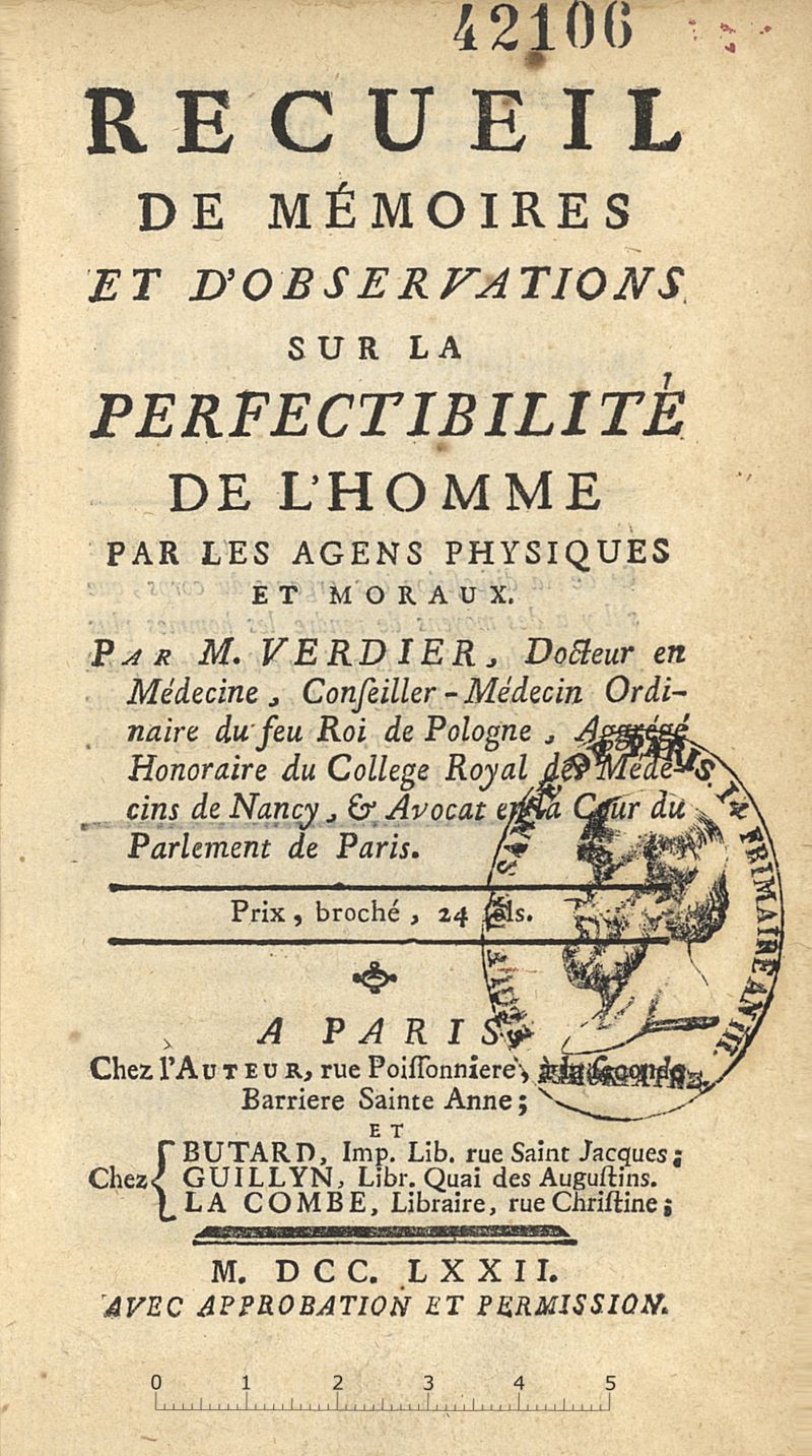 Recueil de mémoires et d'observations sur La perfectibilité de l'homme par les agens physiques et moraux.
