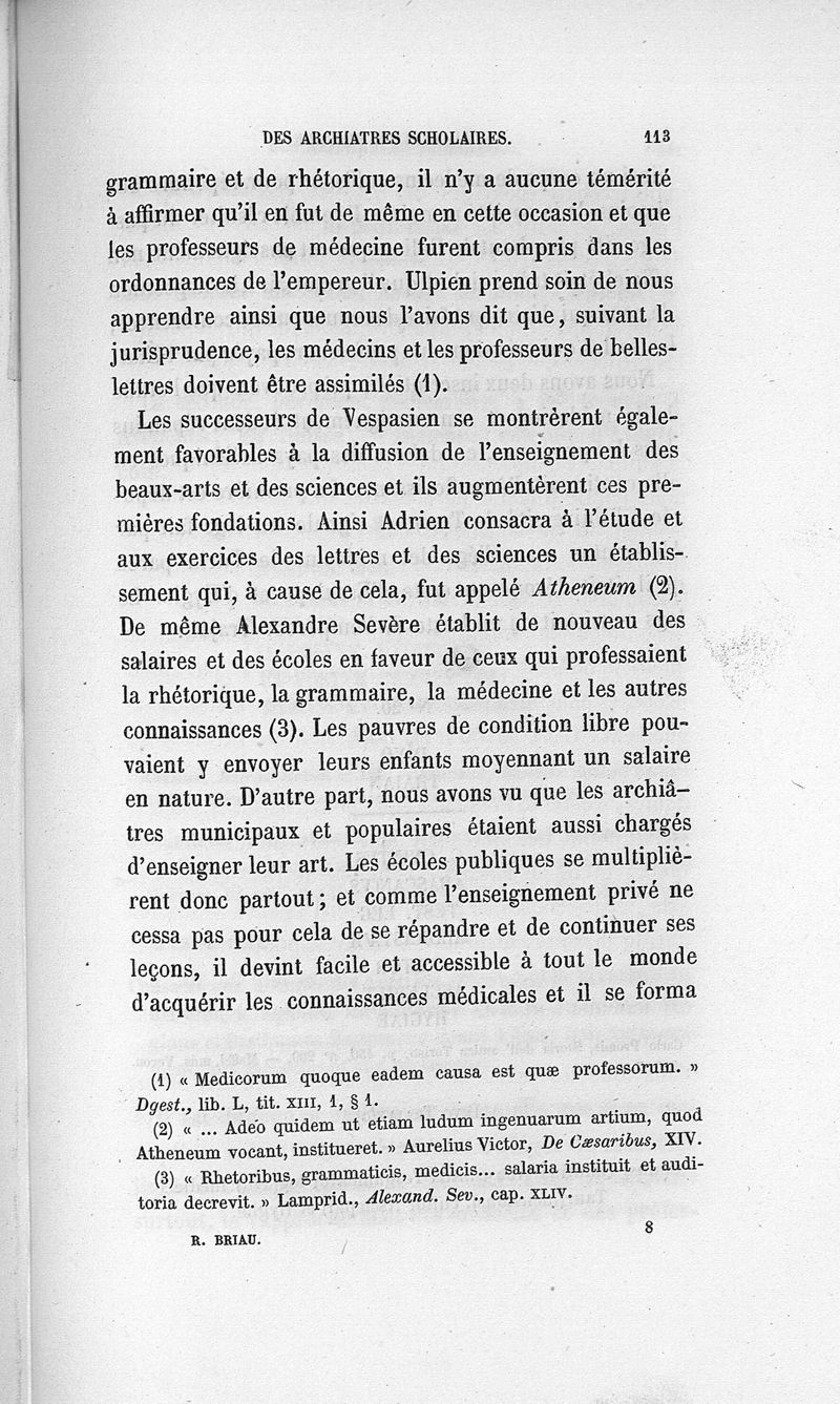 L'archiatrie romaine ou la médecine officielle dans l'Empire romain. Suite de l'histoire de la profession médicale par le Dr René Briau, bibliothécaire de l'Académie de médecine