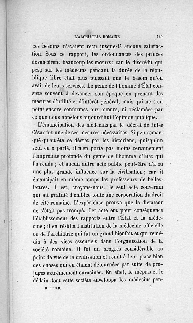 L'archiatrie romaine ou la médecine officielle dans l'Empire romain. Suite de l'histoire de la profession médicale par le Dr René Briau, bibliothécaire de l'Académie de médecine