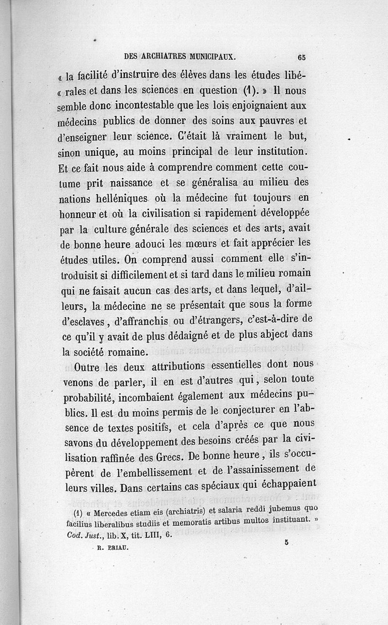 L'archiatrie romaine ou la médecine officielle dans l'Empire romain. Suite de l'histoire de la profession médicale par le Dr René Briau, bibliothécaire de l'Académie de médecine