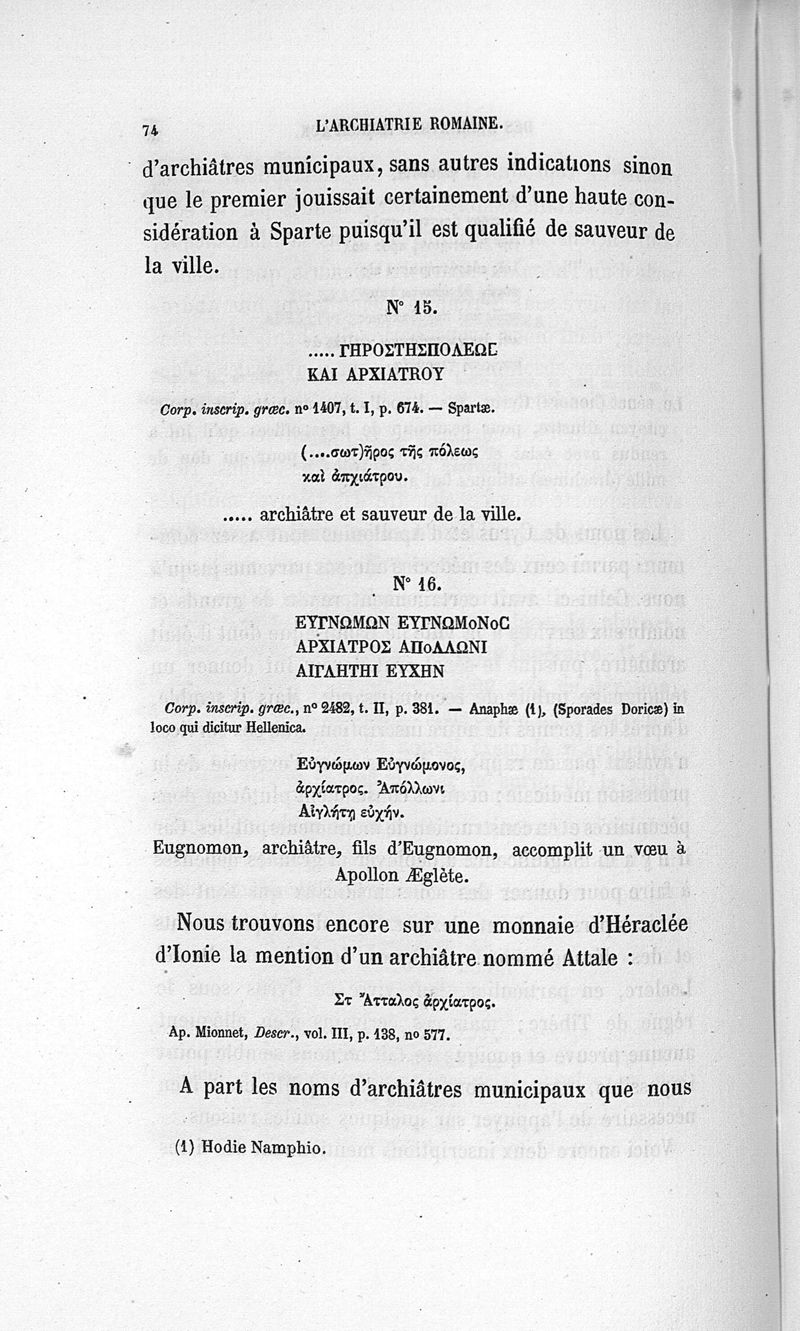 L'archiatrie romaine ou la médecine officielle dans l'Empire romain. Suite de l'histoire de la profession médicale par le Dr René Briau, bibliothécaire de l'Académie de médecine