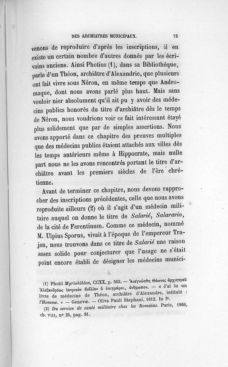 L'archiatrie romaine ou la médecine officielle dans l'Empire romain. Suite de l'histoire de la profession médicale par le Dr René Briau, bibliothécaire de l'Académie de médecine