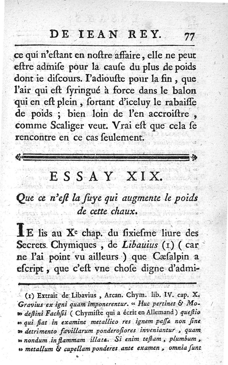 Essays de Jean Rey,...sur la recherche de la cause pour laquelle l'estain & le plomb augmentent le poids quand on les calcine ; nouvelle édition
