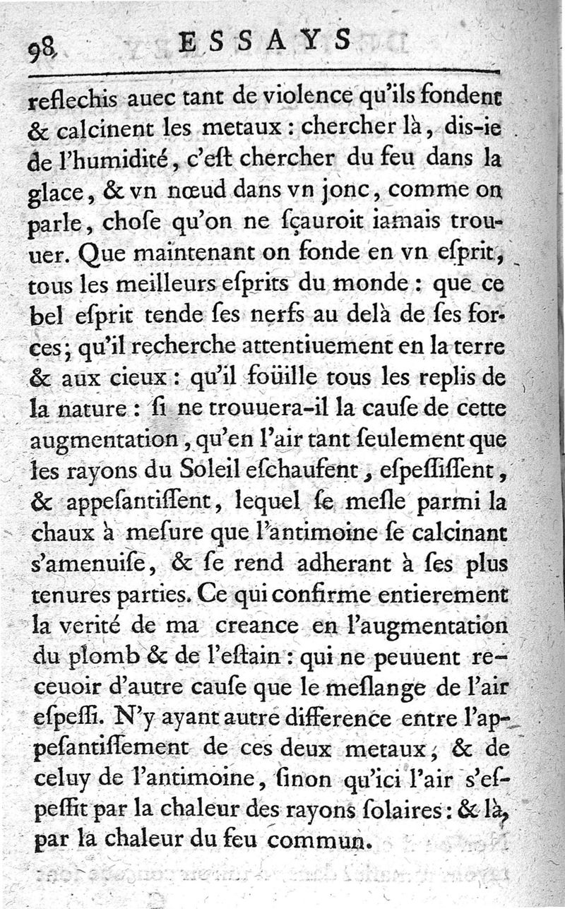 Essays de Jean Rey,...sur la recherche de la cause pour laquelle l'estain & le plomb augmentent le poids quand on les calcine ; nouvelle édition