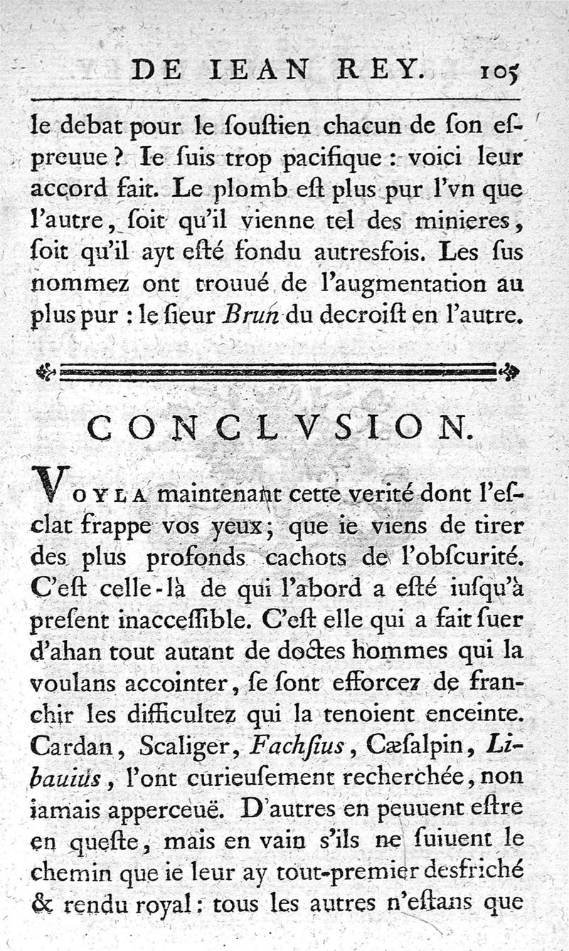 Essays de Jean Rey,...sur la recherche de la cause pour laquelle l'estain & le plomb augmentent le poids quand on les calcine ; nouvelle édition