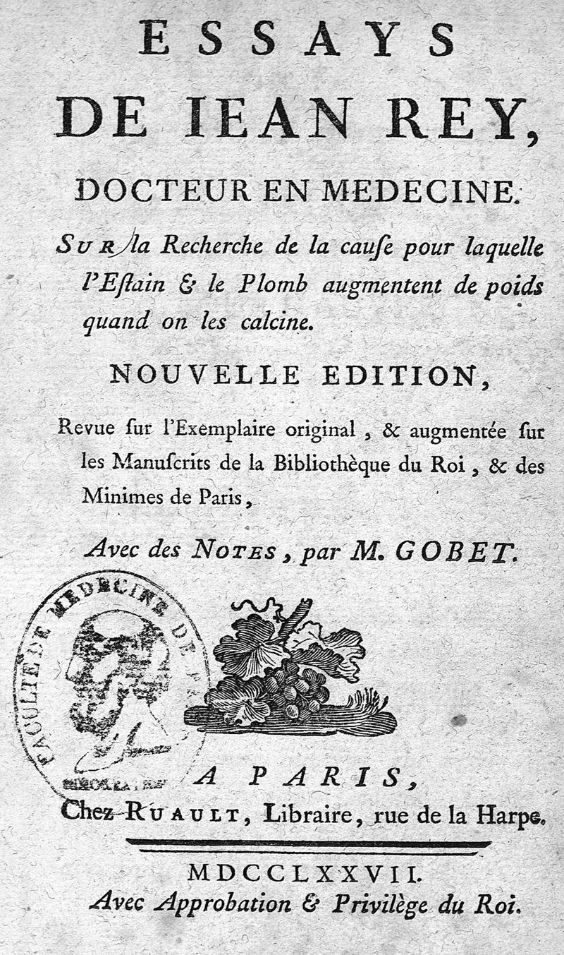 Essays de Jean Rey,...sur la recherche de la cause pour laquelle l'estain & le plomb augmentent le poids quand on les calcine ; nouvelle édition