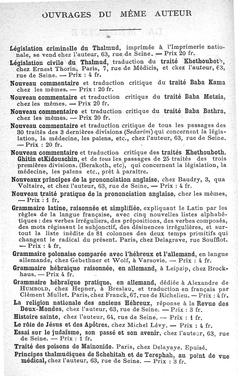 La Médecine du Thalmud, ou tous les passages concernant la médecine extraits des 21 traités du Thalmud de Babylone, par le Dr Israel-Michel Rabbinowicz