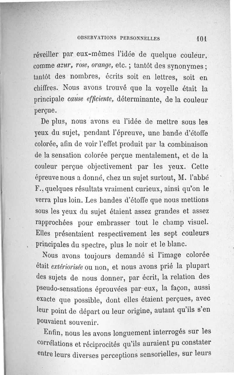 L'audition colorée : étude sur les fausses sensations secondaires physiologiques et particulièrement sur les pseudo-sensations de couleurs associées aux perceptions objectives des sons.