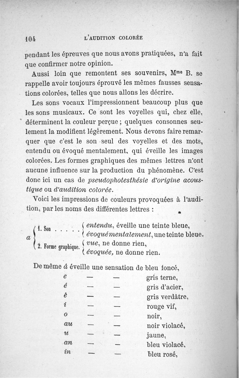 L'audition colorée : étude sur les fausses sensations secondaires physiologiques et particulièrement sur les pseudo-sensations de couleurs associées aux perceptions objectives des sons.