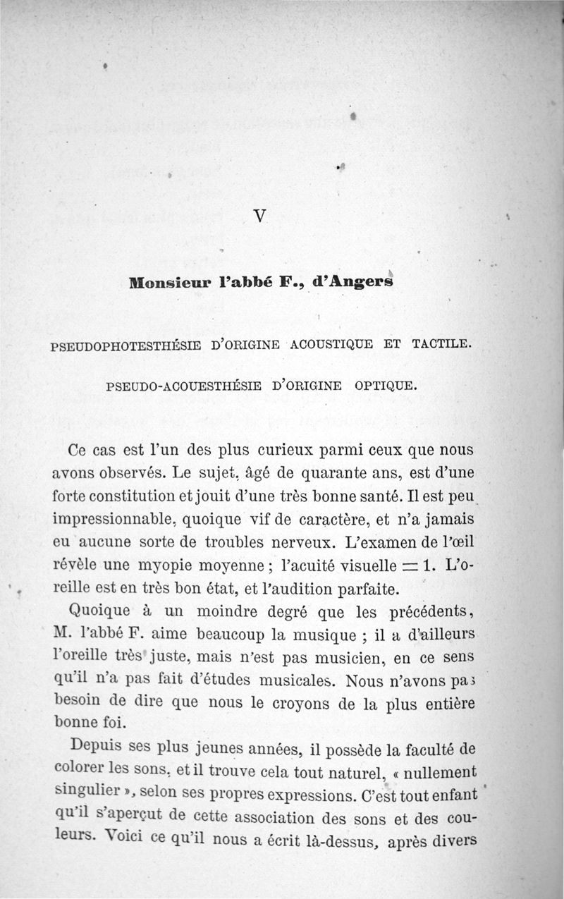 L'audition colorée : étude sur les fausses sensations secondaires physiologiques et particulièrement sur les pseudo-sensations de couleurs associées aux perceptions objectives des sons.