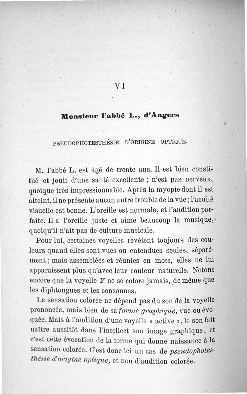 L'audition colorée : étude sur les fausses sensations secondaires physiologiques et particulièrement sur les pseudo-sensations de couleurs associées aux perceptions objectives des sons.