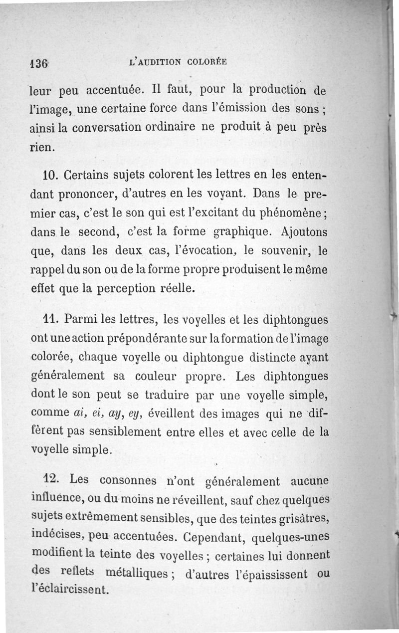 L'audition colorée : étude sur les fausses sensations secondaires physiologiques et particulièrement sur les pseudo-sensations de couleurs associées aux perceptions objectives des sons.