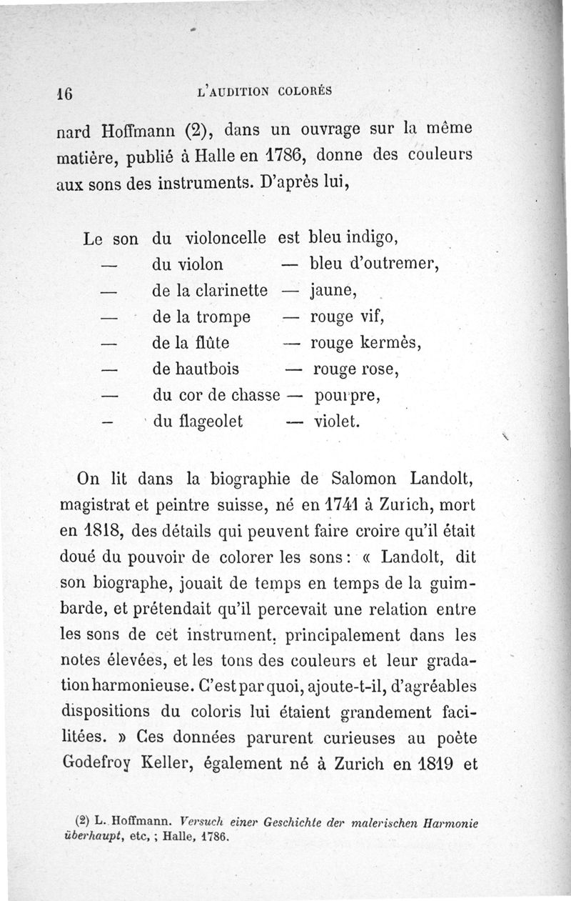 L'audition colorée : étude sur les fausses sensations secondaires physiologiques et particulièrement sur les pseudo-sensations de couleurs associées aux perceptions objectives des sons.