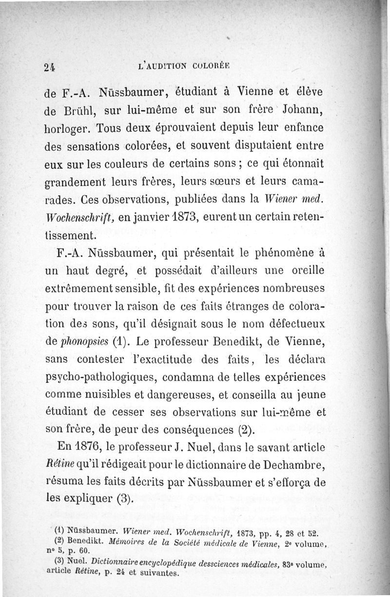 L'audition colorée : étude sur les fausses sensations secondaires physiologiques et particulièrement sur les pseudo-sensations de couleurs associées aux perceptions objectives des sons.