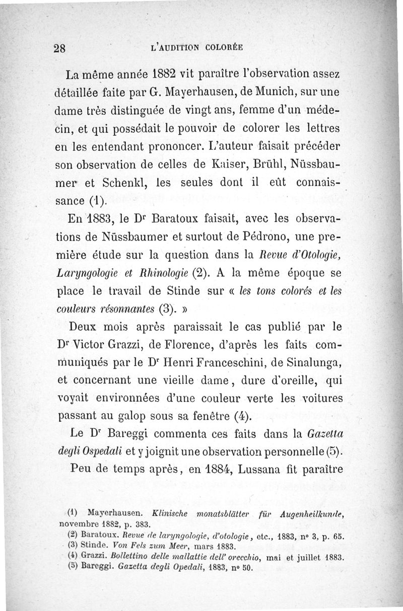 L'audition colorée : étude sur les fausses sensations secondaires physiologiques et particulièrement sur les pseudo-sensations de couleurs associées aux perceptions objectives des sons.