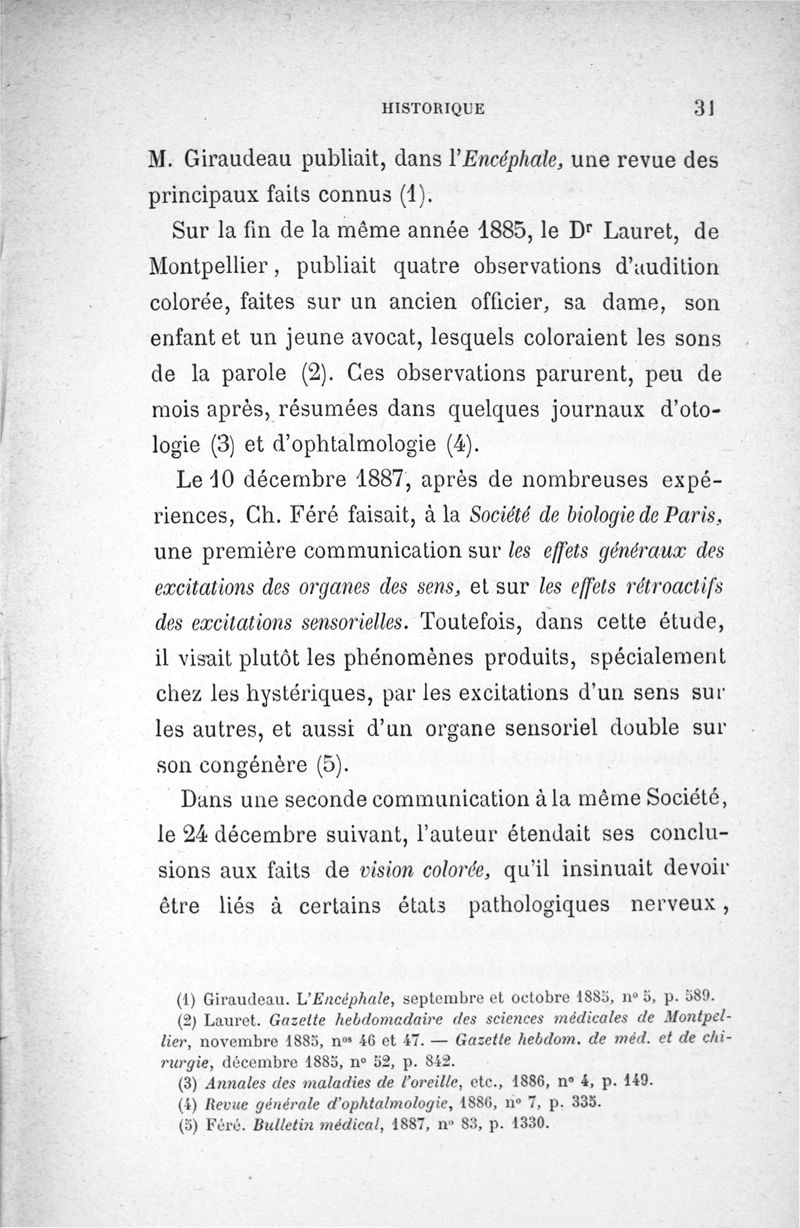 L'audition colorée : étude sur les fausses sensations secondaires physiologiques et particulièrement sur les pseudo-sensations de couleurs associées aux perceptions objectives des sons.