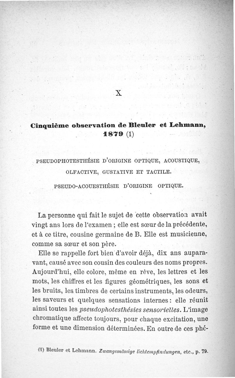 L'audition colorée : étude sur les fausses sensations secondaires physiologiques et particulièrement sur les pseudo-sensations de couleurs associées aux perceptions objectives des sons.