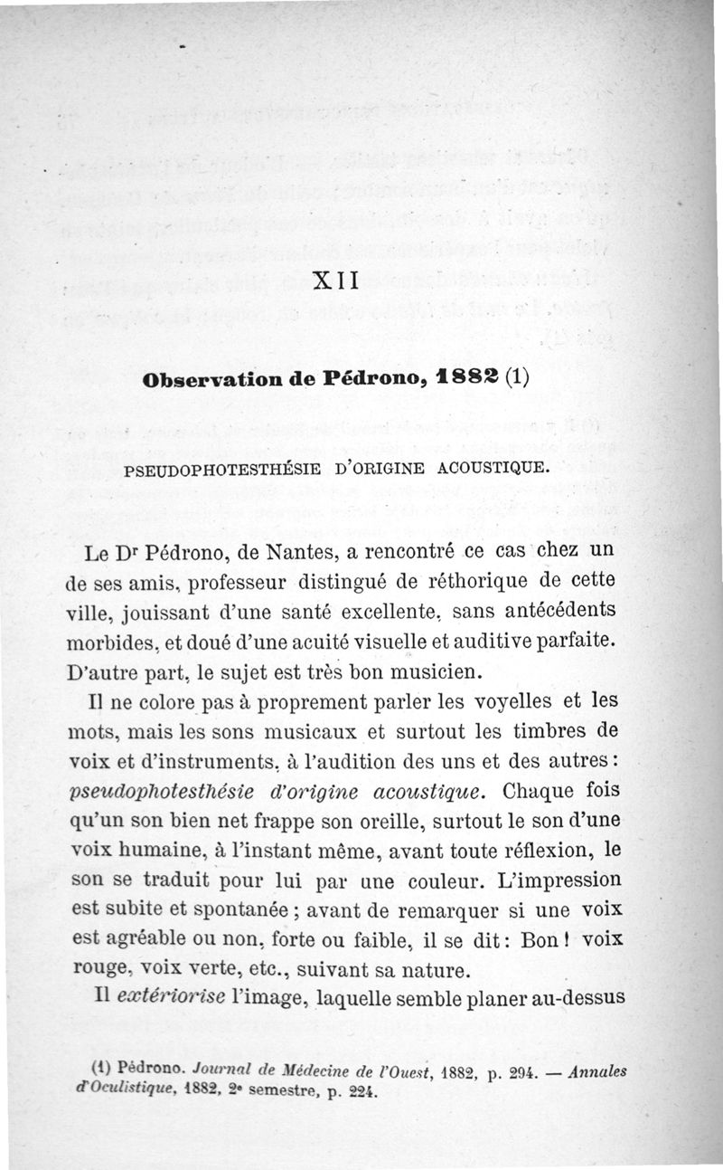 L'audition colorée : étude sur les fausses sensations secondaires physiologiques et particulièrement sur les pseudo-sensations de couleurs associées aux perceptions objectives des sons.