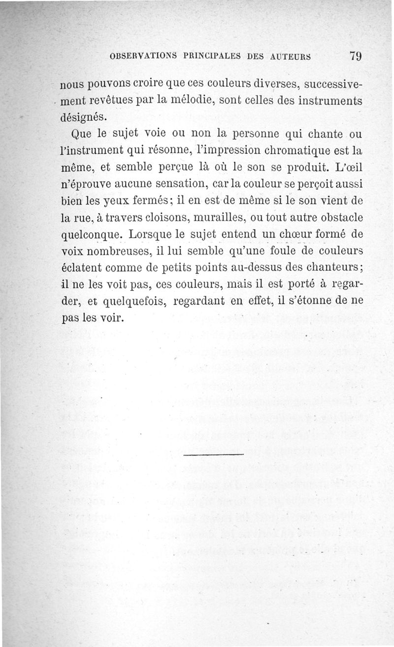 L'audition colorée : étude sur les fausses sensations secondaires physiologiques et particulièrement sur les pseudo-sensations de couleurs associées aux perceptions objectives des sons.