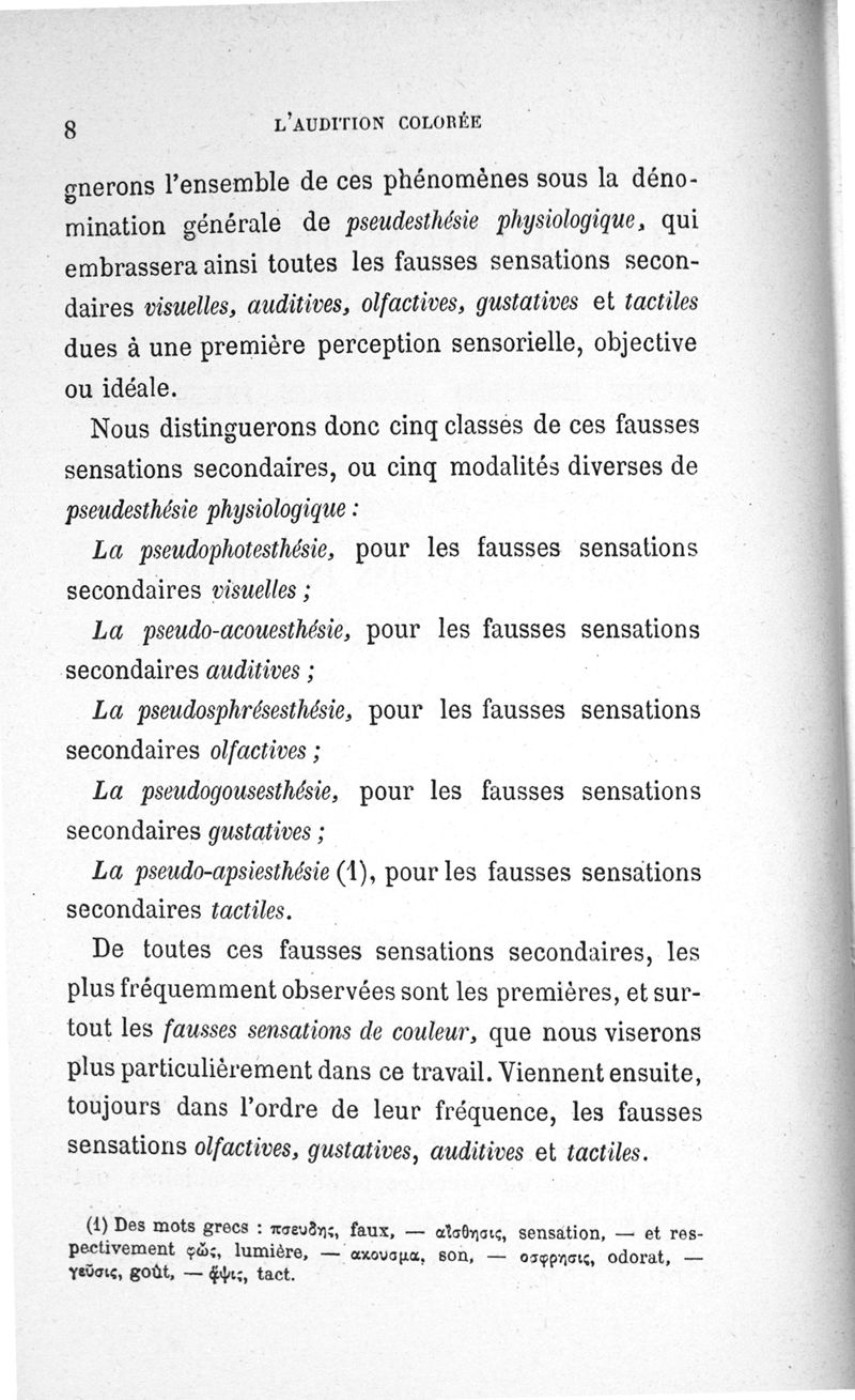L'audition colorée : étude sur les fausses sensations secondaires physiologiques et particulièrement sur les pseudo-sensations de couleurs associées aux perceptions objectives des sons.