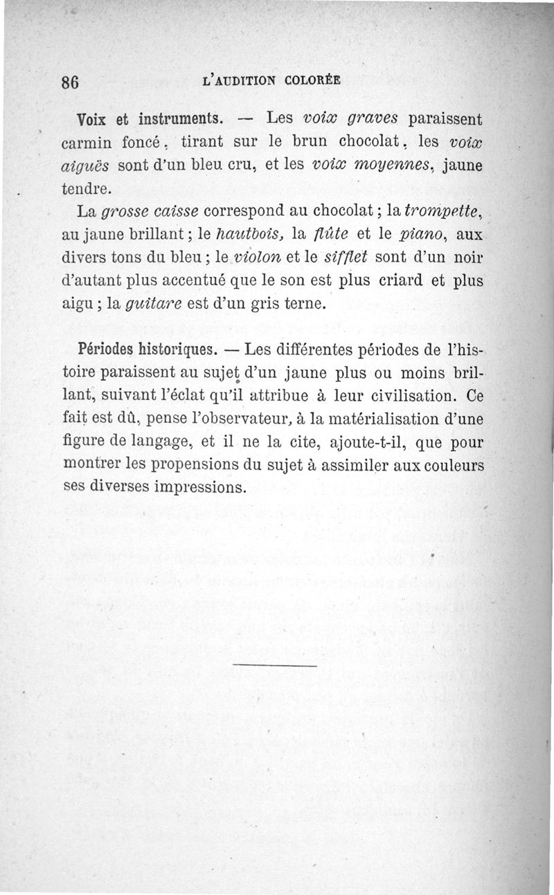 L'audition colorée : étude sur les fausses sensations secondaires physiologiques et particulièrement sur les pseudo-sensations de couleurs associées aux perceptions objectives des sons.