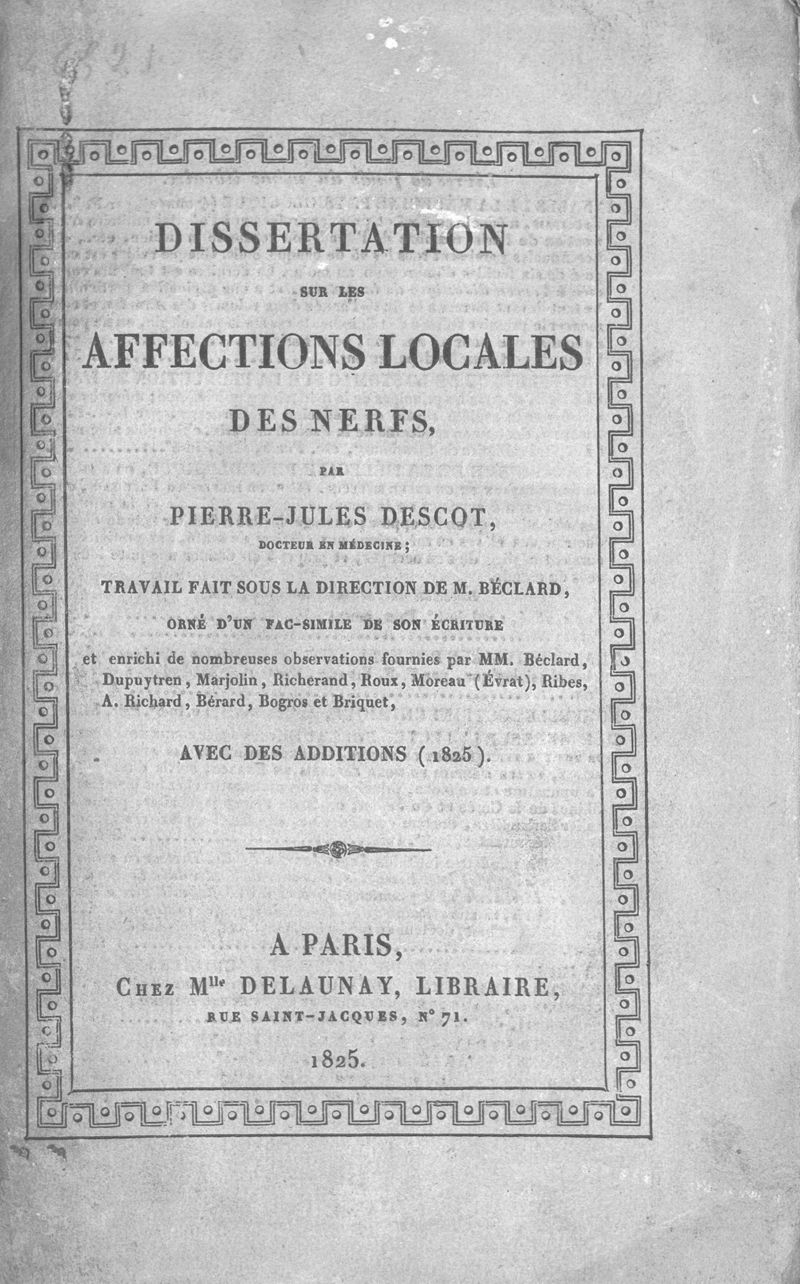 Dissertation sur les affections locales des nerfs, par Pierre-Jules Descot,... travail fait sous la direction de M. Béclard,... et enrichi de nombreuses observations fournies par MM. Béclard, Dupuytren, Marjolin, Richerand, Roux, Moreau (Évrat), Ribes, A. Richard, Bérard, Bogros et Briquet, avec ses additions (1825)
