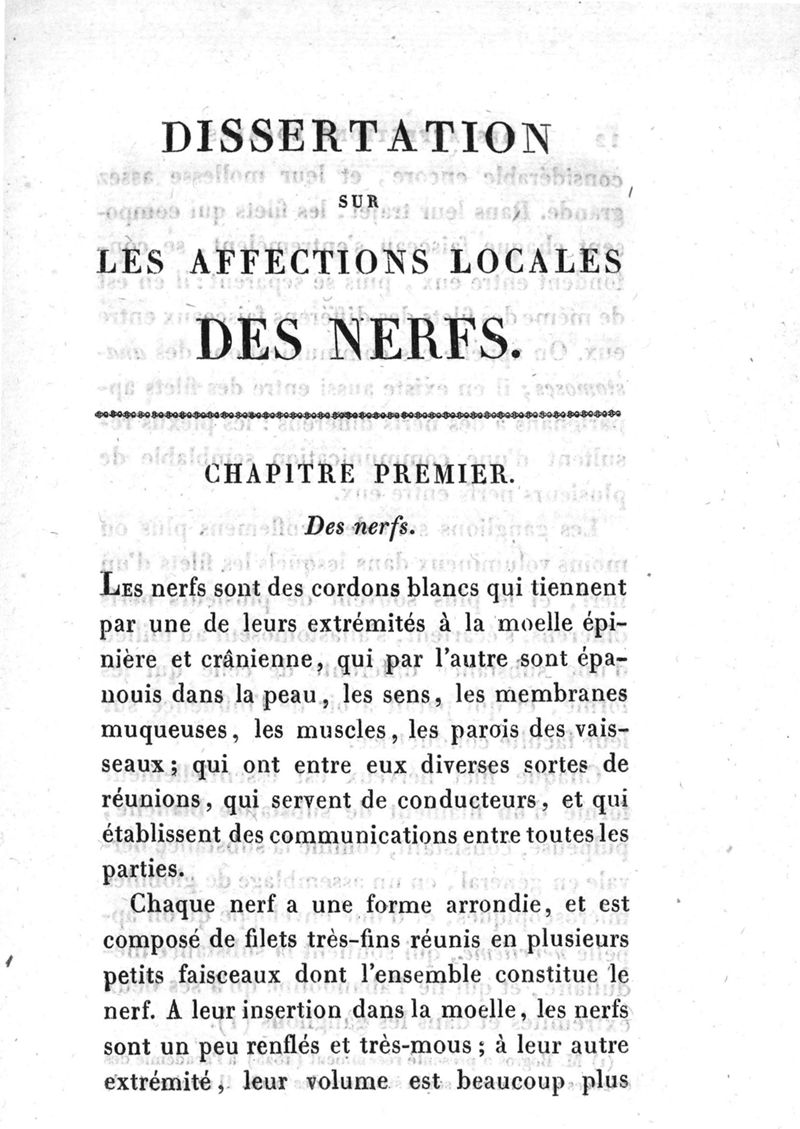 Dissertation sur les affections locales des nerfs, par Pierre-Jules Descot,... travail fait sous la direction de M. Béclard,... et enrichi de nombreuses observations fournies par MM. Béclard, Dupuytren, Marjolin, Richerand, Roux, Moreau (Évrat), Ribes, A. Richard, Bérard, Bogros et Briquet, avec ses additions (1825)