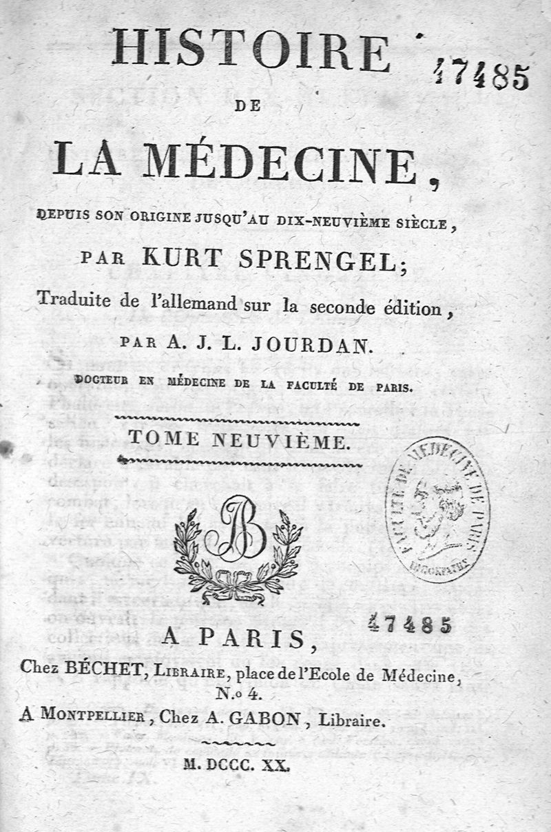 Histoire de la médecine depuis son origine jusqu'au XIXè s. ; traduit de l'allemand sur la seconde édition par A.J.L. Jourdan. Tome 9