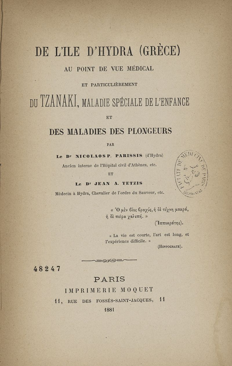De l'île d'Hydra (Grèce) au point de vue médical, et particulièrement du tzanaki, maladie spéciale de l'enfance, et des maladies des plongeurs