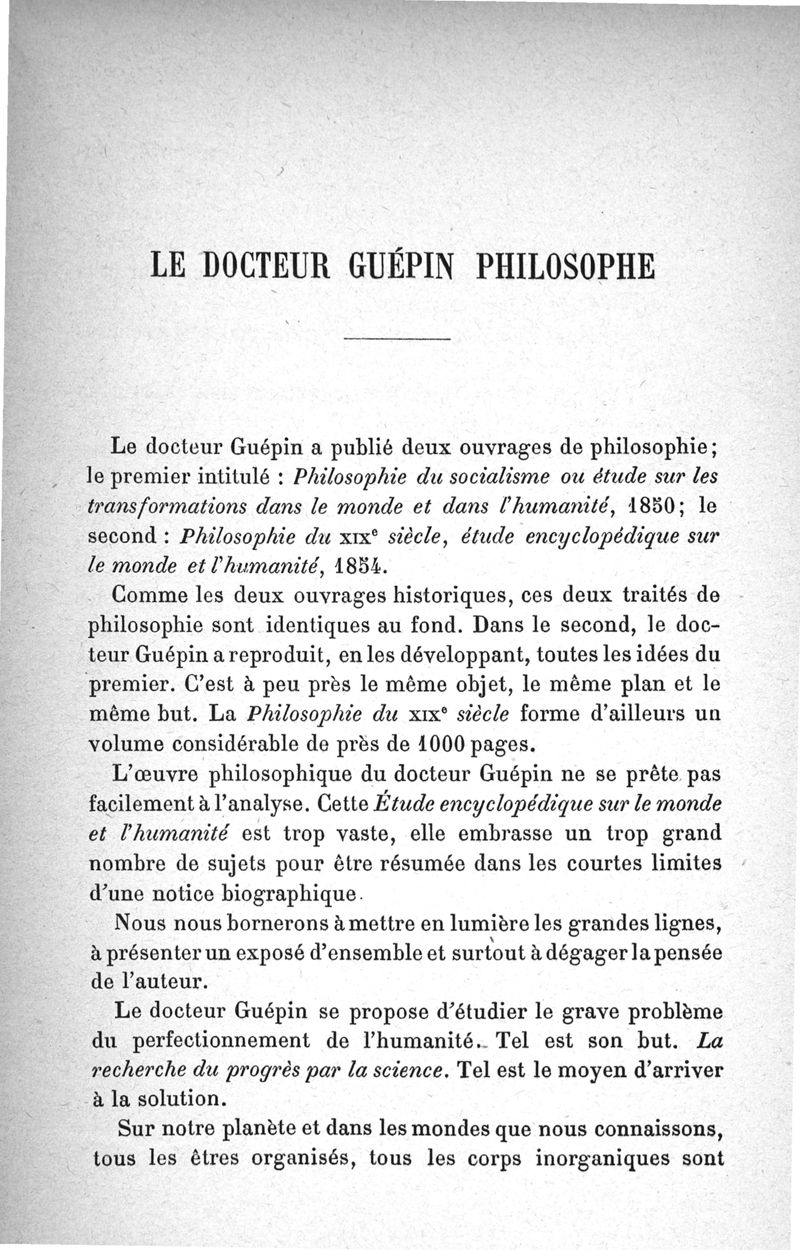 Le docteur Guépin, oculiste, philosophe, historien. Analyse de ses travaux