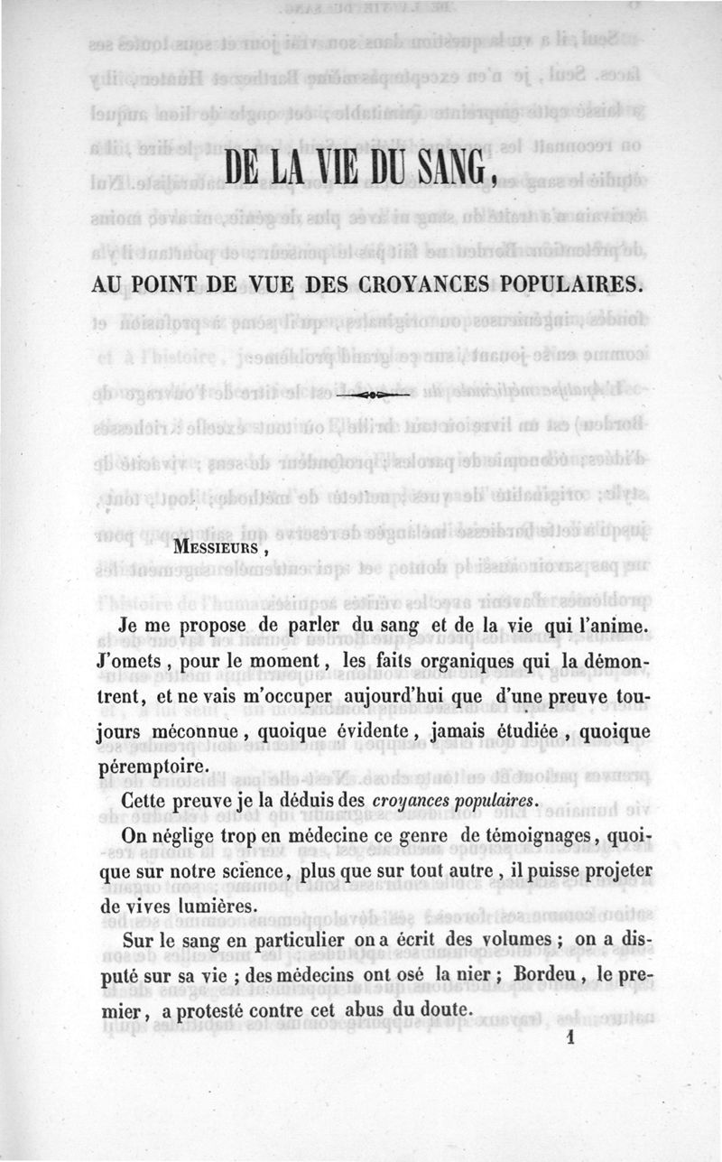 De la vie du sang du point de vue des croyances populaires : discours prononcé à l'ouverture du cours de pathologie et de thérapeutique générale de la Faculté de Médecine de Montpellier, le 19 avril 1844