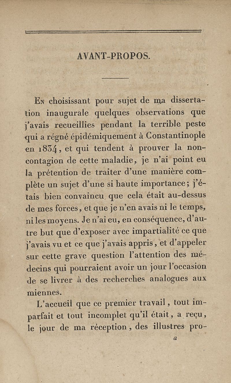 Mémoire sur la peste qui a régné épidémiquement à Constantinople en 1834 et sur sa non-contagion, suivi de quelques réflexions sur les quarantaines et les lazarets