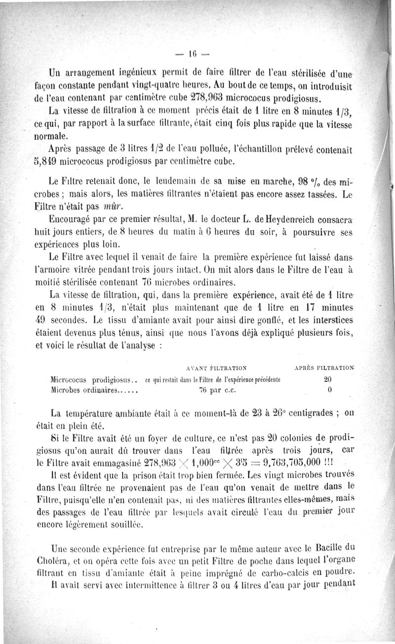 L'Eau purifiée par le filtrage, la question des filtres, le filtre Maignen, les autres filtres, expériences bactériologiques, pollution de l'eau dans les conduites
