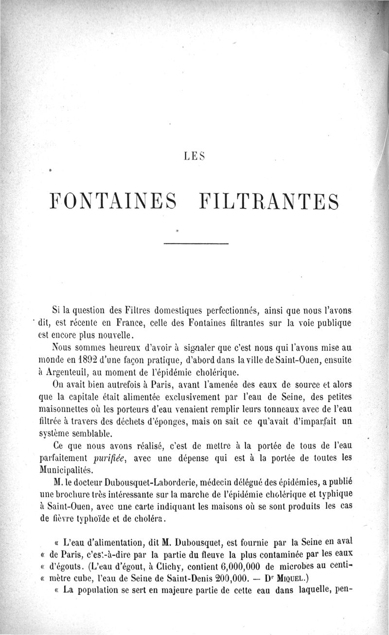 L'Eau purifiée par le filtrage, la question des filtres, le filtre Maignen, les autres filtres, expériences bactériologiques, pollution de l'eau dans les conduites