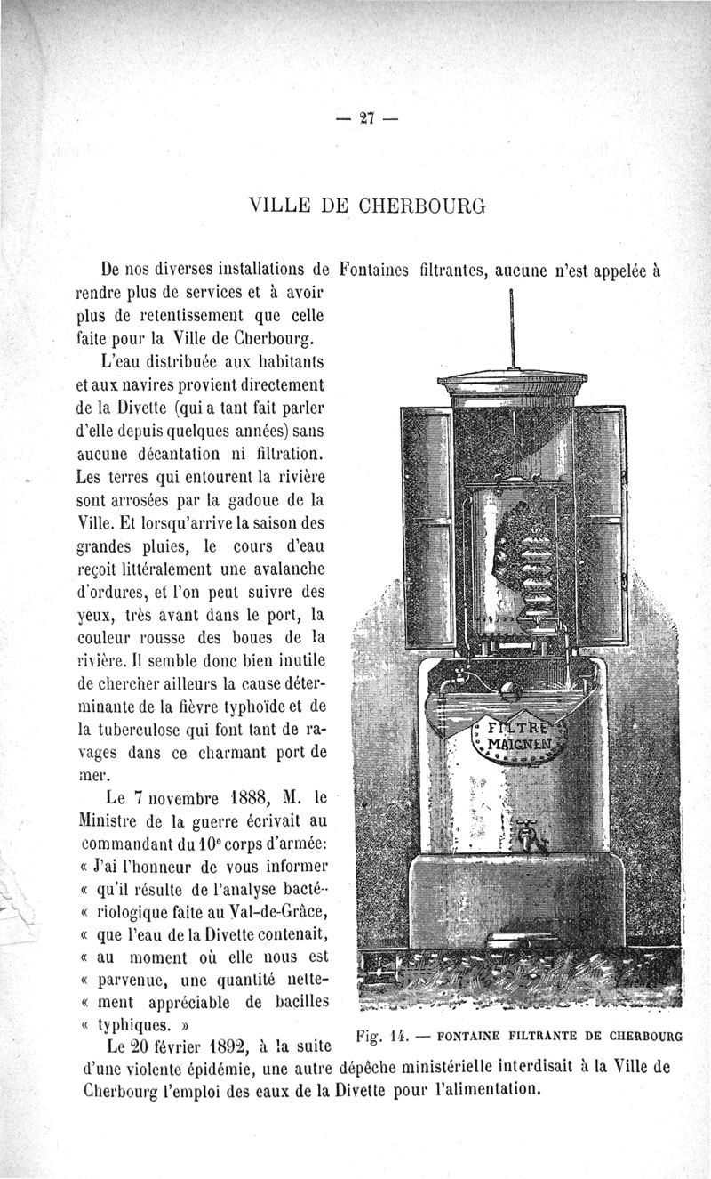 L'Eau purifiée par le filtrage, la question des filtres, le filtre Maignen, les autres filtres, expériences bactériologiques, pollution de l'eau dans les conduites
